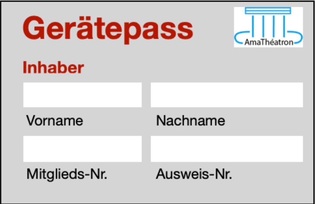 Mit dem Gerätepass können sich Mitglieder Gegenstände für Vereinszwecke ausleihen. Grundsätzlich können alle Gegenstände ausgeliehen werden. Es gibt aber Ausnahmen. Teures Equipment wie Kameraausrüstung, Lichttechnik oder unser Studioarbeitsplatz, stehen nicht allen uneingeschränkt zur Verfügung. Die Geräte sind sehr empfindlich und können schnell kaputt gehen.
